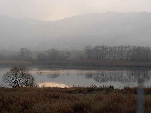 放射冷却の中、大原橋付近は深い霧の中。