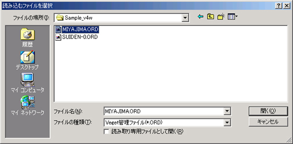 | ・ | CD-ROMの Veget for Windows / Sample_v4wフォルダ内には2つのサンプルデータファイル「MIYAJIMA.ORD」と「SUIDEN-0.ORD」があります。 |