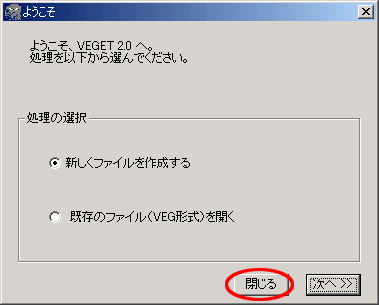 | ・ | 起動後の読み込みウィンドウ(ようこそ)が表示されたら、「既存のファイル(VEG形式)を開く」にチェックし、「次へ >>」をクリックしてください。 |
