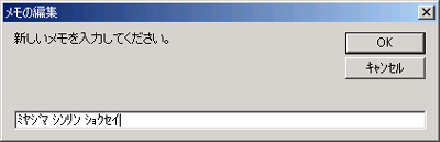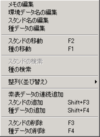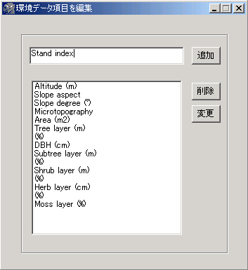 (2)メモ、環境データ項目名、スタンド名、種名の訂正 ・ メモ、環境データ名、スタンド名および種名の訂正には、「編集」メニューから「メモの編集」、「環境データ名の編集」、「スタンド名の編集」、「種データの編集」をそれぞれ選択して下さい。 ・ 「編集」→「メモの編集」で、メモの編集ウィンドウが表示されますので、ここで訂正作業を行ってください。 ・ 「編集」→「環境データ名の編集」で、環境データ項目の編集ウィンドウが表示されますので、ここで訂正作業を行ってください。 ・ 環境データ項目の追加は、「追加」ボタン左側の白抜き部に直接追加する項目を入力した後「追加」ボタンをクリックしてください。 削除及び変更は、既存の項目の中からマウスで該当項目を選択し、「削除」もしくは「変更」ボタンをクリックしてください。