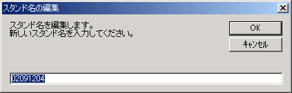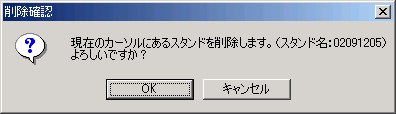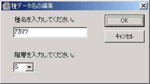 図はStand indexを追加する場合・ 素表ウィンドウ上で、スタンド名を変更したいスタンドの通番をクリックして下さい(選択されたスタンドの列の色が変わります)。 ・ 「編集」→「スタンド名の編集」で、スタンド名の編集ウィンドウが表示されますので、ここで訂正作業を行ってください。 ・ 素表ウィンドウ上で、種名を変更したい種の名前部分をクリックして下さい(選択された種の行の色が変わります)。 ・ 「編集」→「種データの編集」で、種名の編集ウィンドウが表示されますので、ここで訂正作業を行ってください。 (3)スタンドと種データの削除 ・ 素表ウィンドウのスタンドのデータ(縦一列)と種のデータ(横一行)をそれぞれ削除するには、「編集」メニューの「スタンドの削除」、「種データの削除」を実行します。 注: データの削除はやり直しがききませんので、十分注意して実行してください。 ・ スタンドの削除は、削除したいスタンドを素表ウィンドウ上で、マウスを使って指定してください(該当するスタンドの通番をクリック)。 ・ 選択したスタンド(縦一列)の色が変わります。 ・ その後、「編集」→「スタンドの削除」を実行すると、確認メッセージが表示されますので、削除するのであれば「OK」を選択してください。
