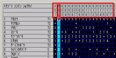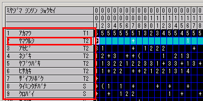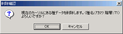 ・ 種データの削除は、まず始めに削除したい種を素表ウィンドウ上で、マウスを使って指定してください(該当する種データの種名をクリック)。 ・ 選択した種データ(横一行)の色が変わります。 ・ その後、「編集」→「種データの削除」を実行すると、確認メッセージが表示されますので、削除するのであれば「OK」を選択してください。