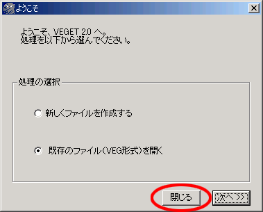| ・ | ウィンドウズ版VEGETを起動させたら、「ようこそ」ウィンドウの「閉じる」ボタンをクリックして、とじてください。 |
