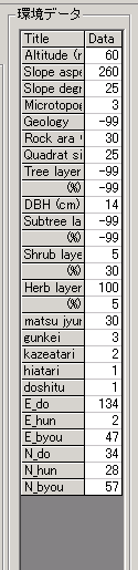 | ・ | それぞれの環境データ数は、「Syoudosima.VEG」(左側)が31項目、「tesima.VEG」(右側)が27項目で、その内容は以下の通りです。 |