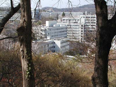 植物園から見た理大 (中央が生物地球システム学科のある21号館)