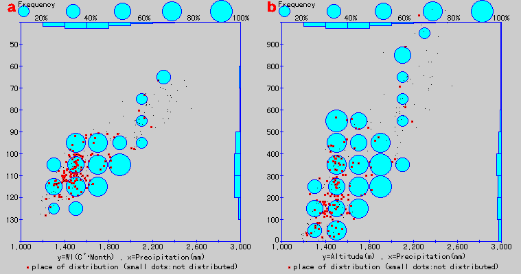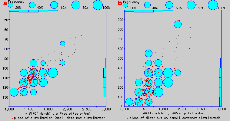 推定主要分布地の条件:海抜20〜380m,年降水量1,240〜1,800o,WI100℃以下