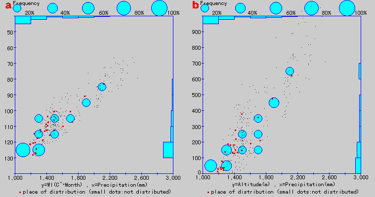 これらの種は記載した順で,WI120℃以上の地域で分布の極大を示すものから,WI110℃以上の少し広い範囲で極大を示すものへと推移している。海抜,年降水量における出現傾向も比較的似た様子で推移しており,各々の環境要因の相互の相関が高いことがうかがえる。