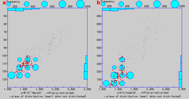 推定主要分布地の条件:海抜10〜250m,年間降水量1,200〜1,650o,WI105℃以上