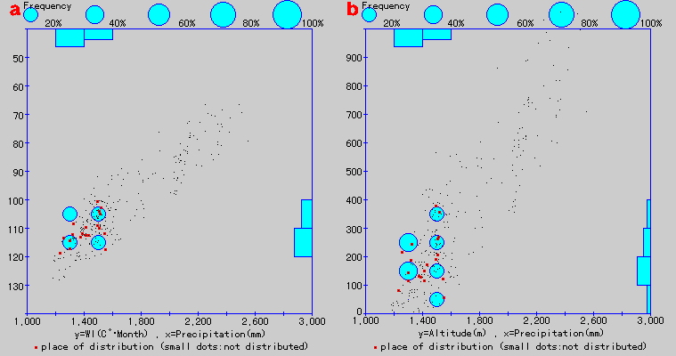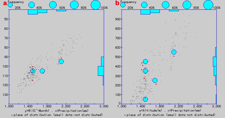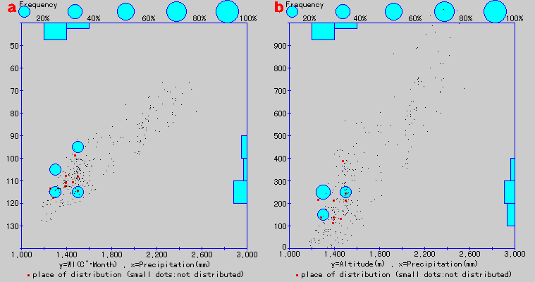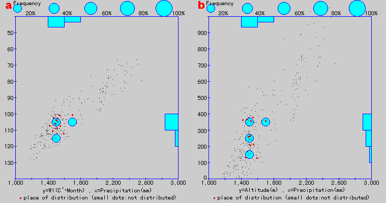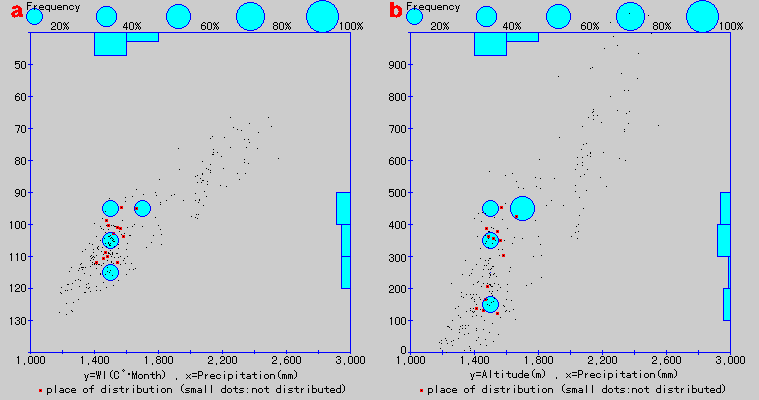 推定主要分布地の条件:海抜111〜243m,年間降水量1,254〜1502o,WI108〜117℃