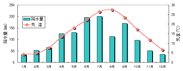 | 図2.岡山市の月平均気温と降水量(図3,4の+の位置のメッシュ気候値による). |
