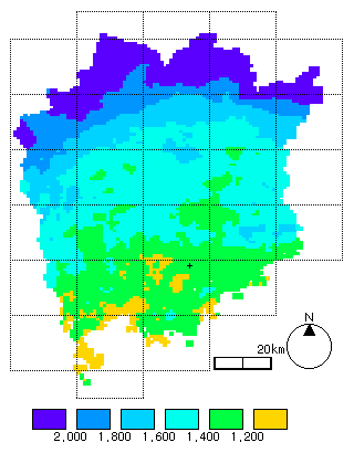年降水量の分布では,1200mmに満たない地域が沿岸部の諸処に分布している。1400mmに満たない地域は内陸にまで入り込みながら南部に広範に分布してる。このような地域は,広島県福山平野,及び兵庫県播磨平野の一部にも分布している。メッシュ気候値による岡山県沿岸南部の年降水量は,梅雨が平年並みに訪れた場合の値であり,空梅雨に見舞われると,半減してしまうものと考えられる。中国脊梁を隔てた日本海側に位置する鳥取市では約2000mm,太平洋側に面した四国の高知市では約2600mmの雨量に恵まれており(岡山県,1993),これらに比べると,いかに少ない雨量であるかがうかがえる。
